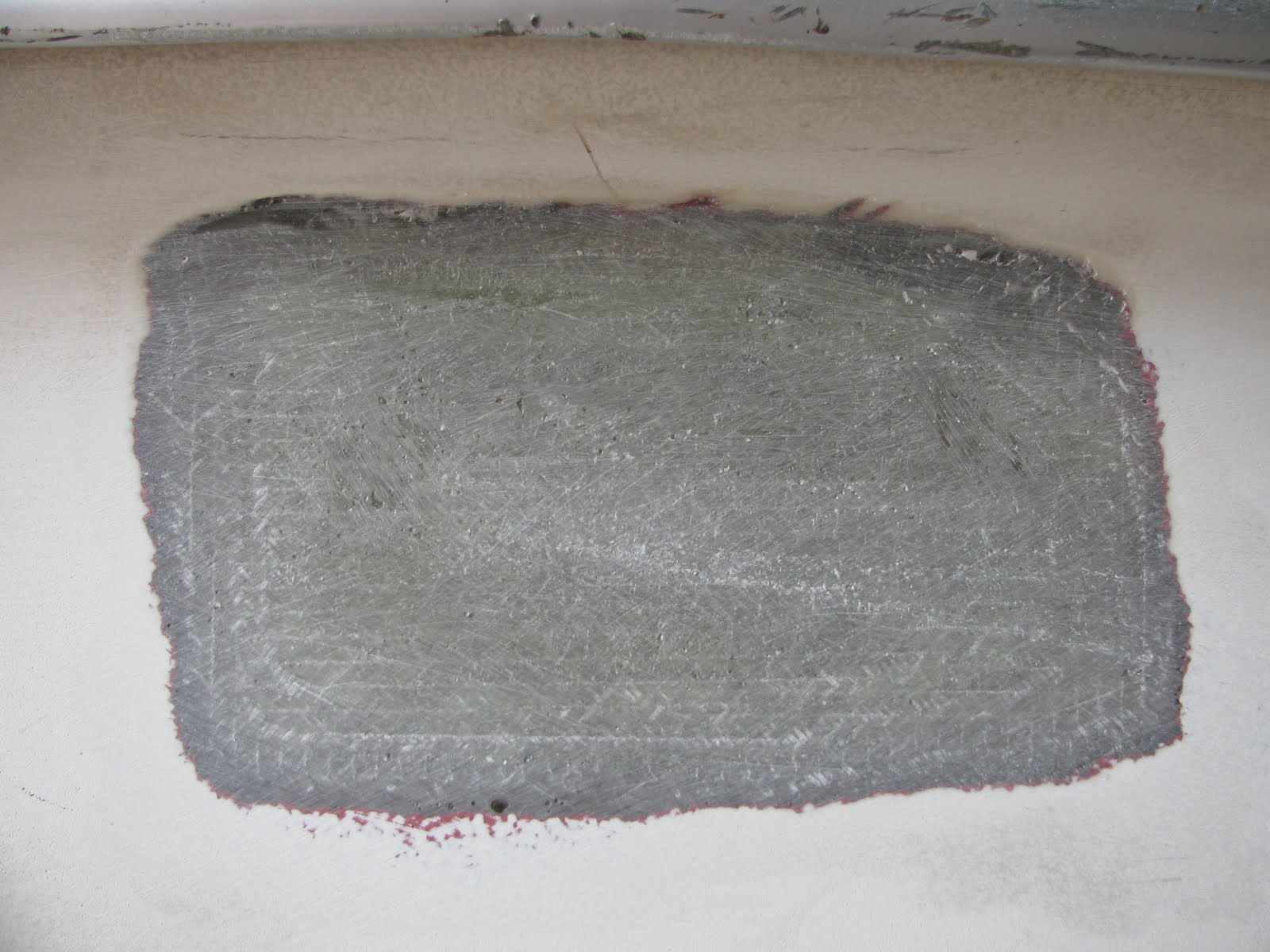Ok, I messed up a little with the pictures, what else is new? In Hull Repair Part 1 we left off with the glass applied from inside the hull. The next little bit did not get photographed but what happened was we sanded the hull to form a bevel that extends about two inches around the cut out. After the bevel was sanded some filler was used to avoid air pockets and then a couple layers of glass was applied.