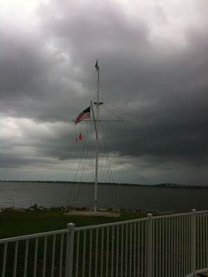 The thunderstorms started Sunday night, with the first feeder-bands of Tropical Storm Alex doing slowly moving through. While I lost most of this (Monday) morning to a migraine, Jeff finished up a few key boat issues (change the spin sheets end-for-end. Reposition the mast to its usual spot (How DID it go 5 inches forward? We sailed at 28/9 yesterday for practice and oddly, we were competitive. Weird.) Replace the main halyard, that sort of thing). So when I emerged from my cozy bear-cave after my Zomeg-enhanced nap, I was surprised to find there was no sunshine. But Jeff had launched the boat (yay!), and we were ready to go...