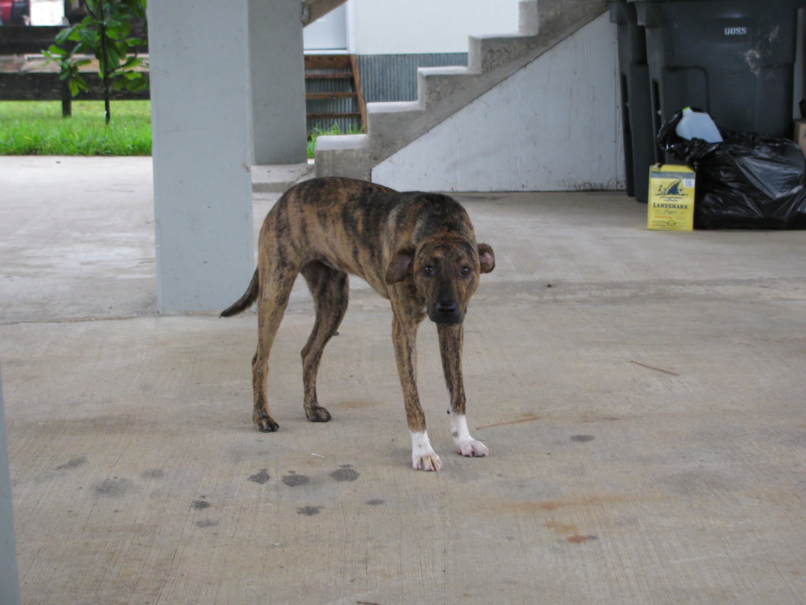 As we travel, we are greeted by 3 dogs that run off their porch (not much in the way of fences or leashes in these parts) and follow us home. Carrie lifted Alfie for the walk back to the house, Missy and Lexi managed to make friends after the human energy calmed down. They seemed young, one brown hound-y looking male, one brindle pit-mix female with white socks on her front feet, and a small, black male with all-too-prominent ribs. We continued on our way home, with our escorts. As we leave to go racing, the female stayed on our steps.