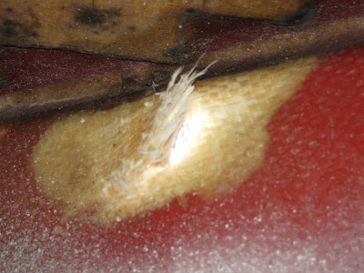 The hole from inside the cabin, light spots are delaminated glass, actually 24oz. roving. Early Scots were made with roving before they switched to a better fiberglass fabric