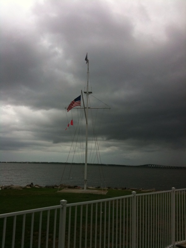 At around 3 or so, even though it looked steely and grey across the water, the postponement flag went down…Despite the thunderclap that sounded just as Clinton reached the flagpole. There was a scramble to launch and head out, only to be turned back to the harbor as the steely and grey storm-clouds began rolling toward us, growling, and the bridge disappeared, and everything got another good rinsing.