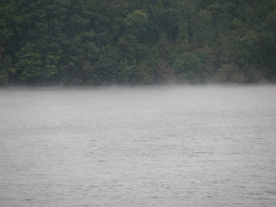 As we sailed to the course, "Smoke on the Water" came to mind. The water was warmer than the air for a very cool effect. As lakes will be, the shiftiness abounded. We did well in the first race and the wind shifted left and right and up and down. RC made a few adjustments and the sun started to make an appearance. We haven't auto tacked in a long time, was the observation of the day. In the third race, it seemed like we couldn't do anything right, and poor planning at the start snowballed into a big mess.