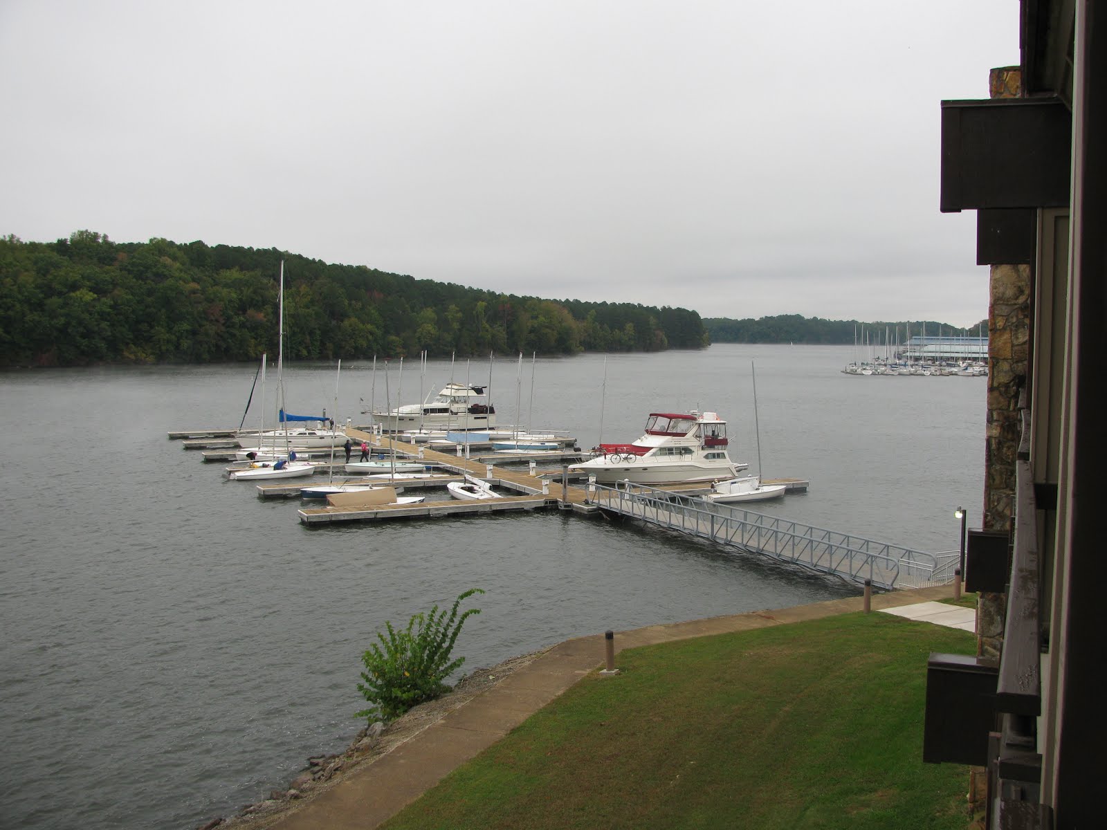 After a leisurely wake-up, the second half of the trip went more quickly than we expected. The rest of Team Tampa ended up with our surly friend at exit 179, and we arrived at the beautiful entrance to Joe Wheeler State Park around 10:30 local time. Harry and Karen were already in the parking lot setting up, and we joined them. Sailors needed to ramp launch and sail or be towed to the docks at the Lodge. By noon, we're in the water, and by 1:40 pm, we're checked in. The Lodge has a restaurant and we had some tasty lunch before tuning up out on the lake.